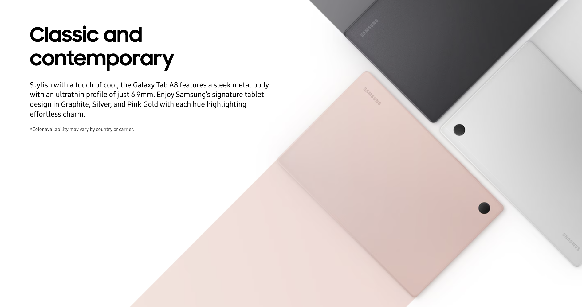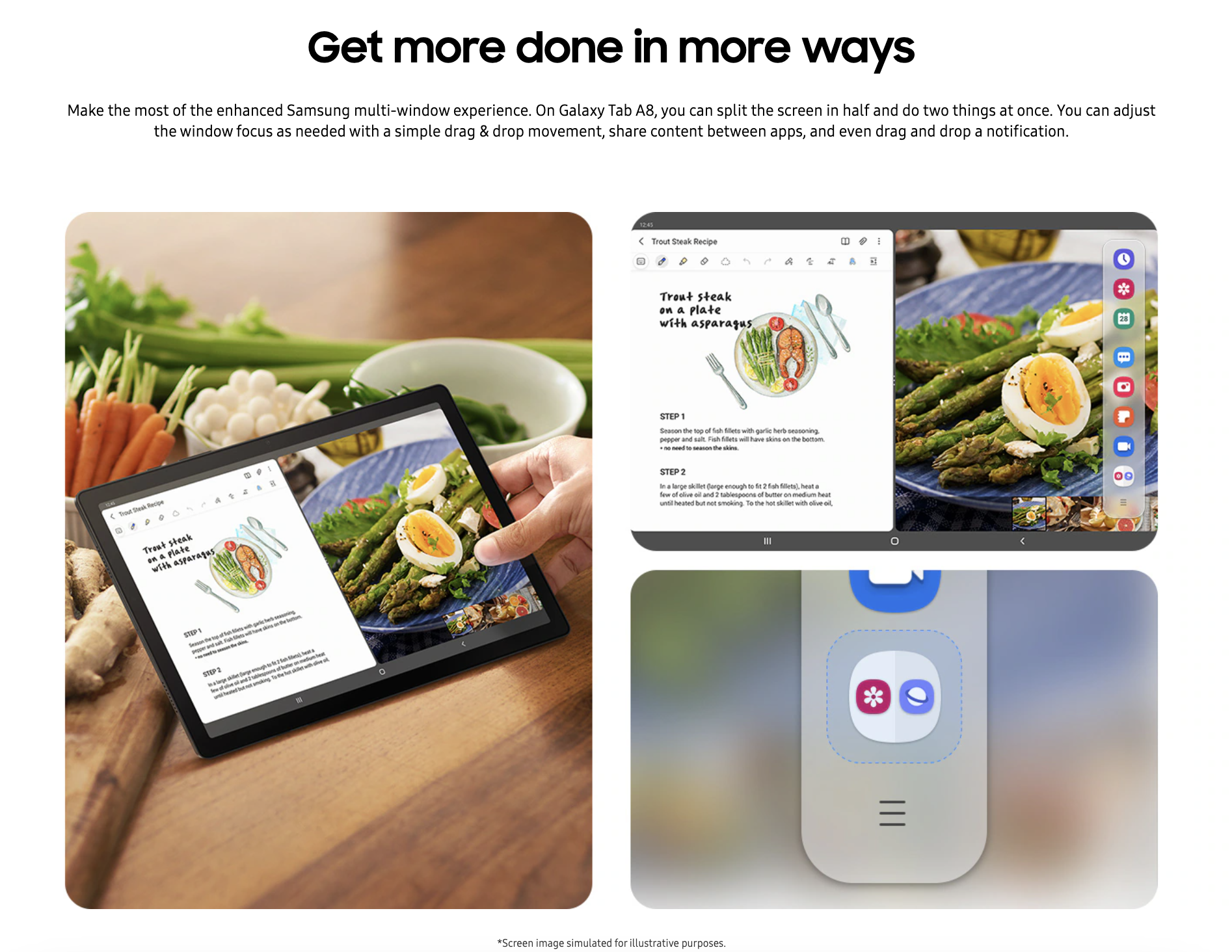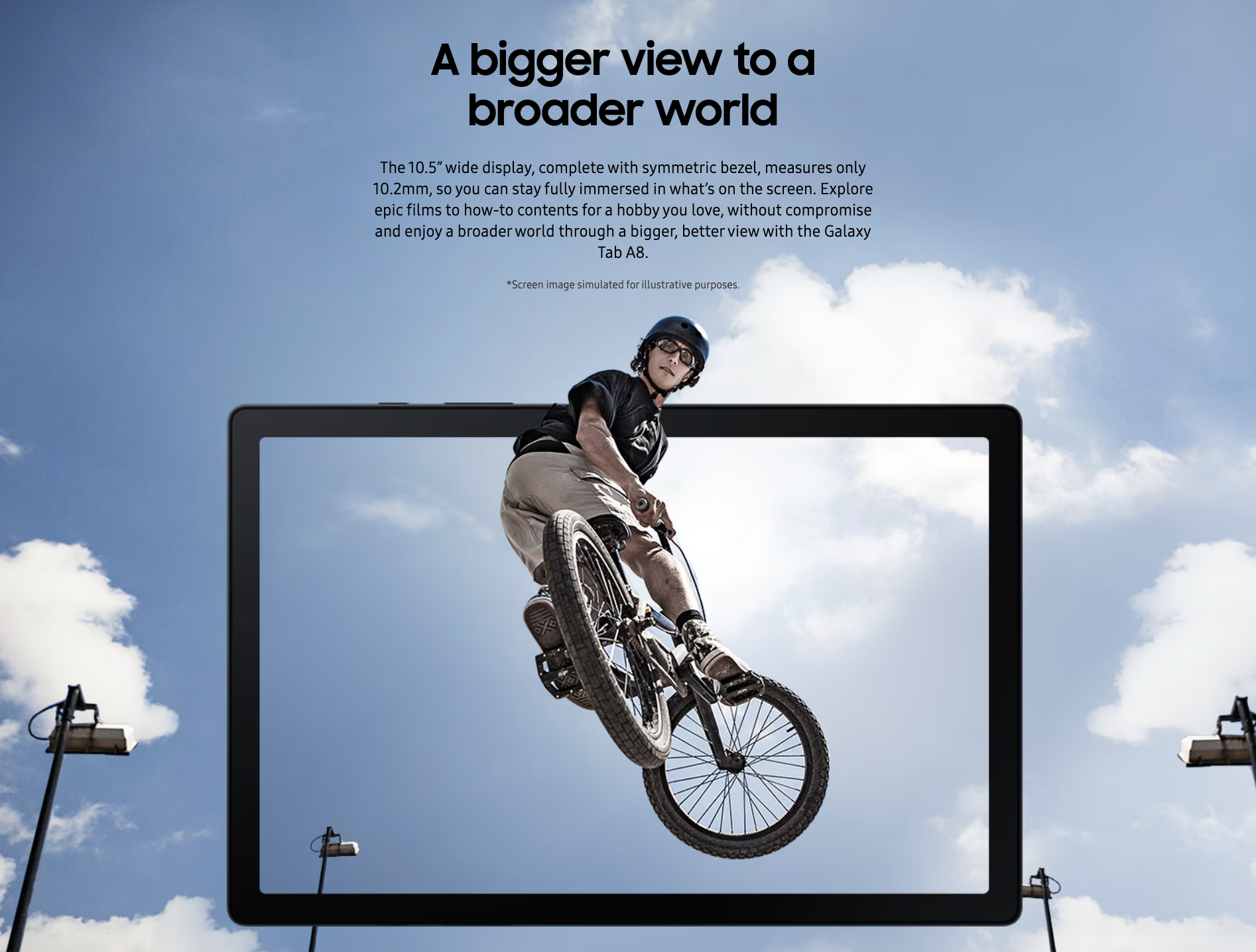 The 10.5” wide display, complete with symmetric bezel, measures only 10.2mm, so you can stay fully immersed in what’s on the screen. Explore epic films to how-to contents for a hobby you love, without compromise and enjoy a broader world through a bigger, better view with the Galaxy Tab A8.
